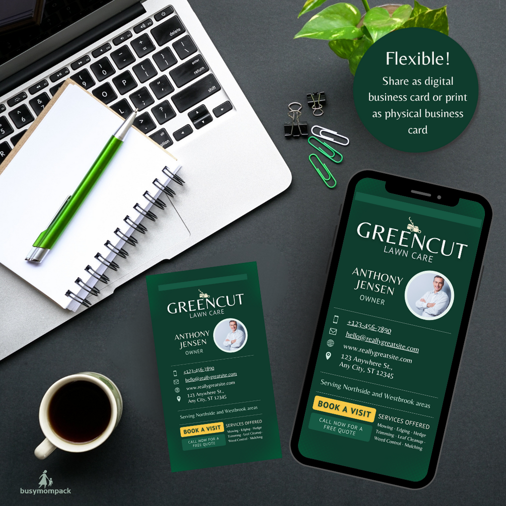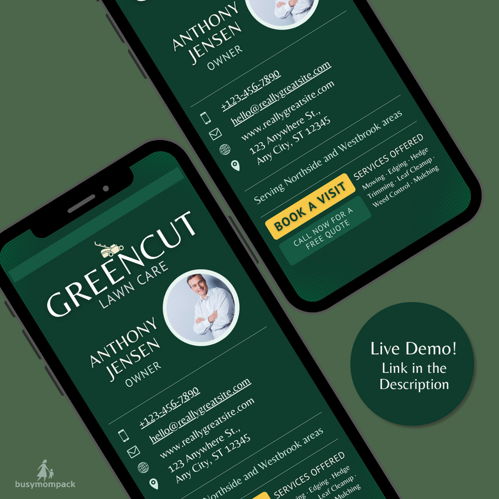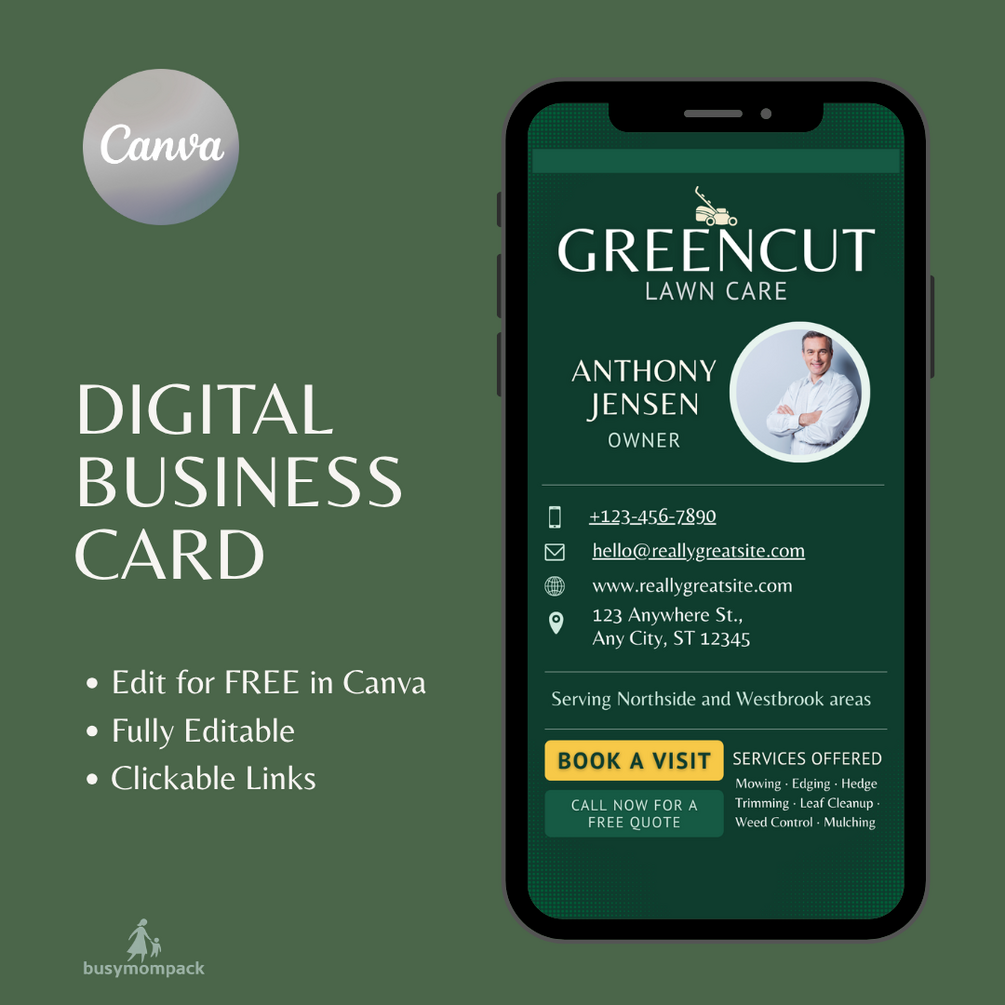 A digital businesscard is the easiest way to promote your lawn care service, lawn maintenance, lawn mowing, or landscaping service without printing costs. Share your lawn service details anytime — in person, by text, email, or on social media. You’ll never be without your card again. Send it as a static image, or share a clickable PDF or link so clients can call, email, or book instantly.