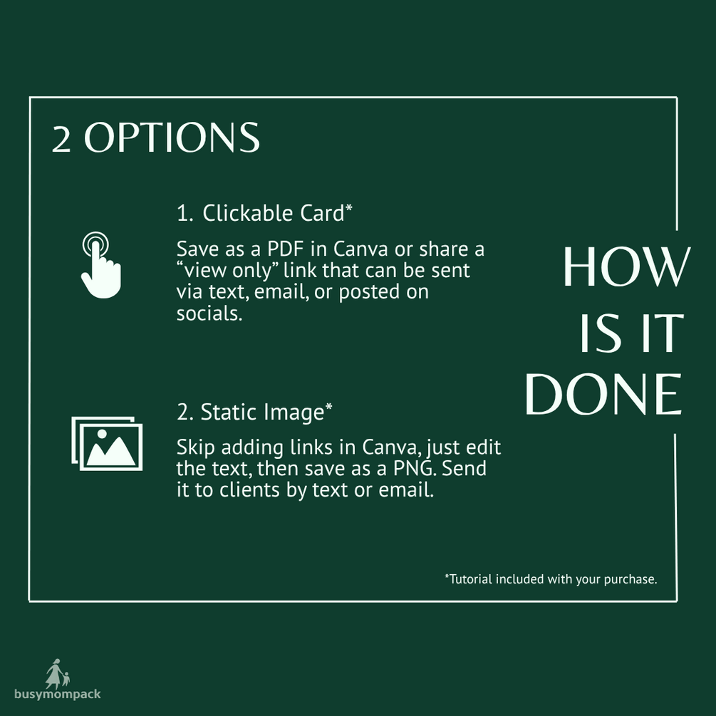 Save as a clickable PDF, shareable link, or static image depending on how you connect with clients.