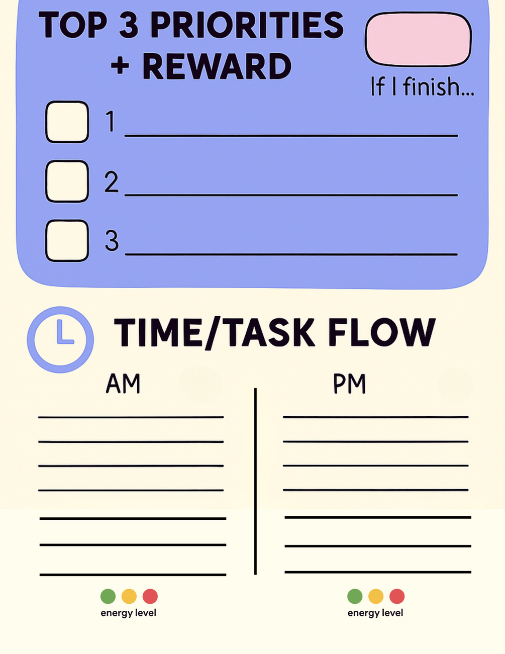 - Top 3 Priorities + Focus Tracker – dopamine, not pressure